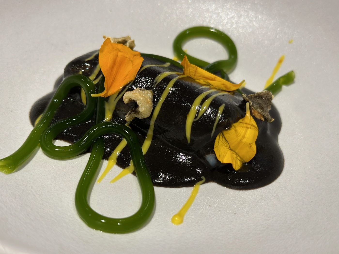 - Bacalaó tiznaó a baja temperatura acompañado de salsa de papas con choco, con alioli de azafrán de la Mancha y espagueti de perejil y torreznitos de la piel del bacalao.