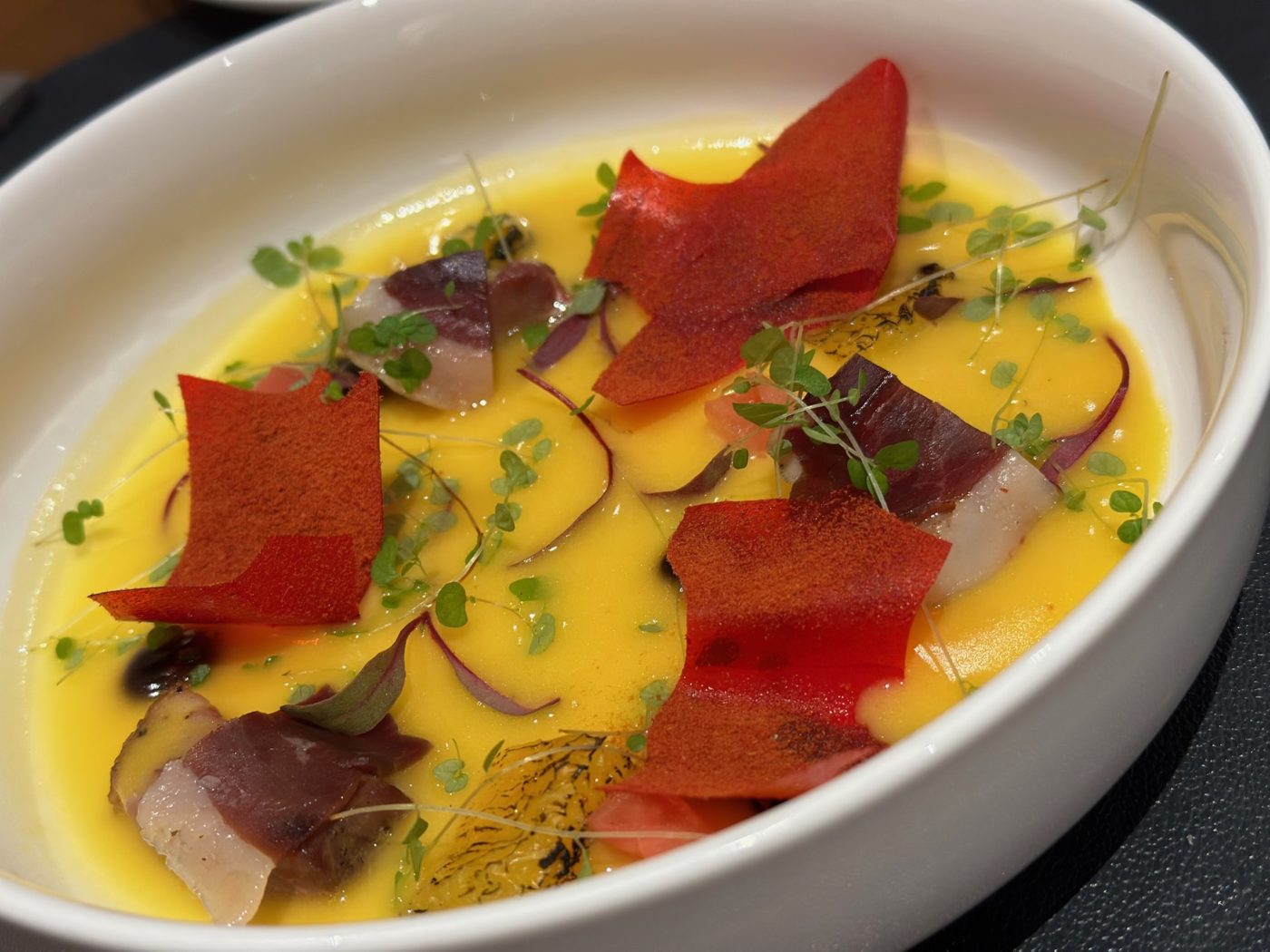 - Magré de pato en escabeche de naranja al fondo con crujiente de tomate y patata, brotes de remolacha, lentejuela y dados de naranja regado con AOVE.